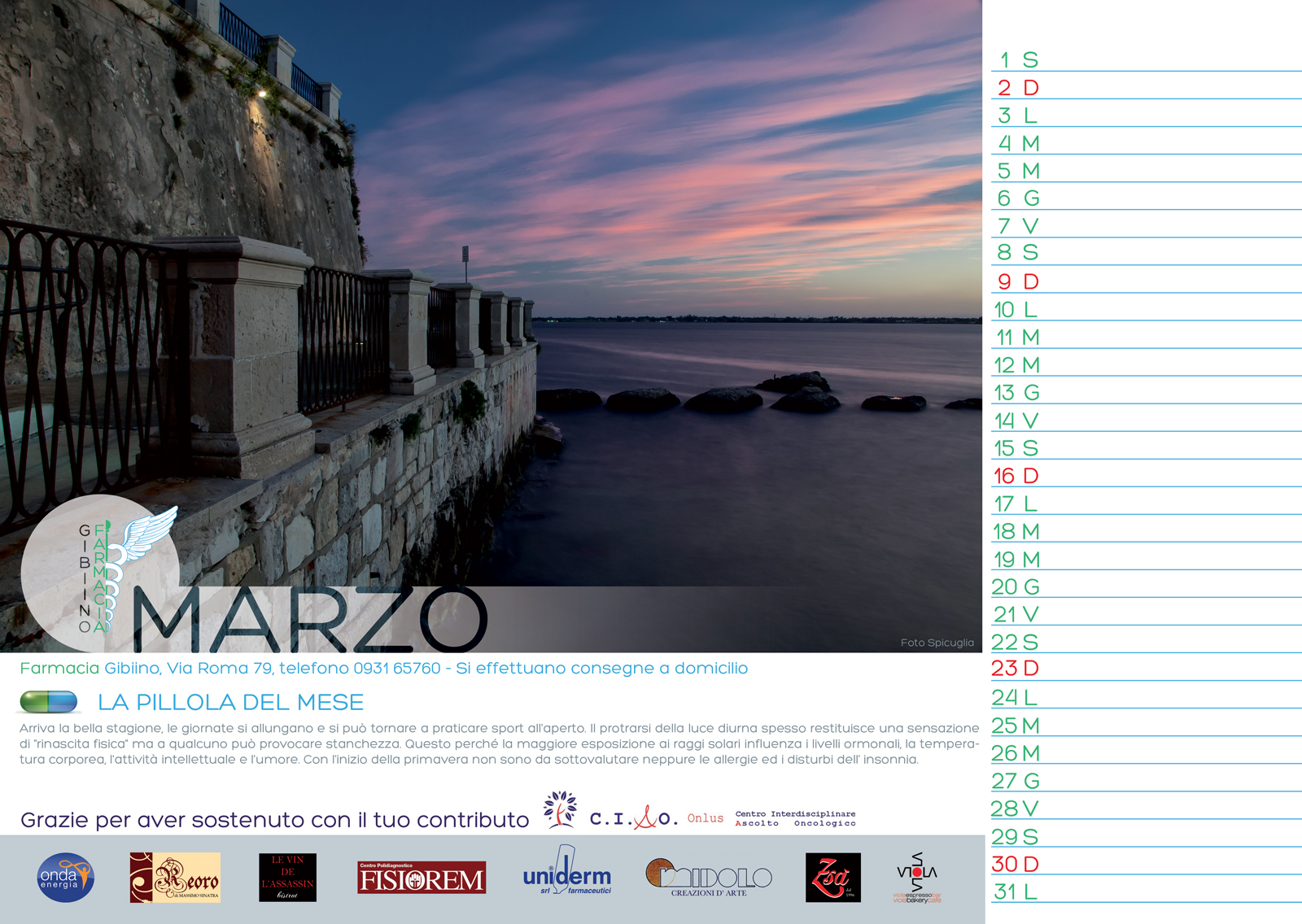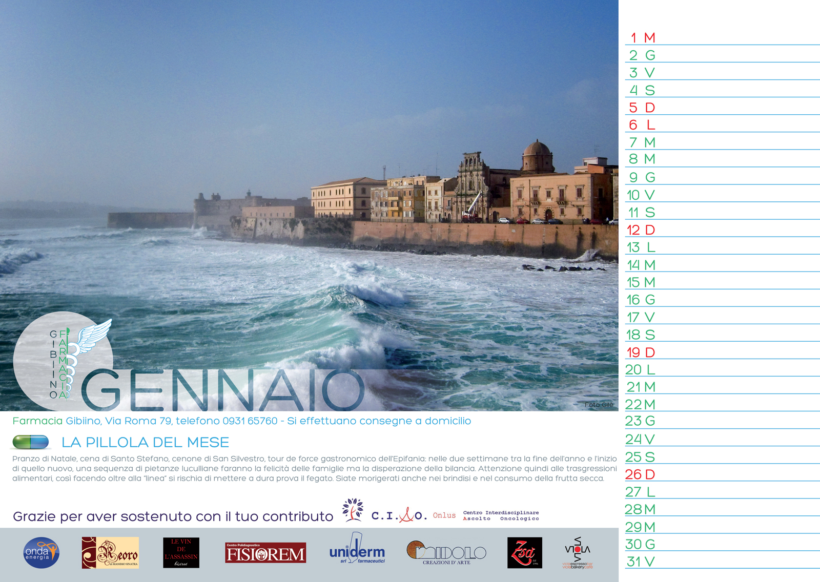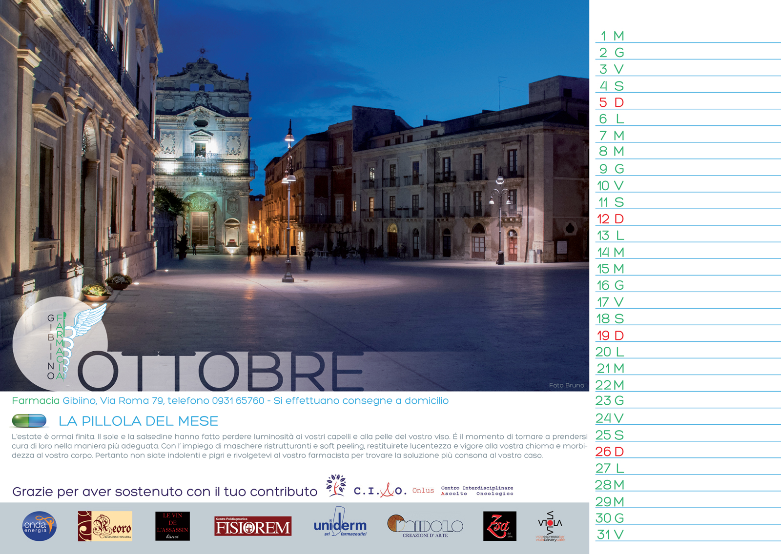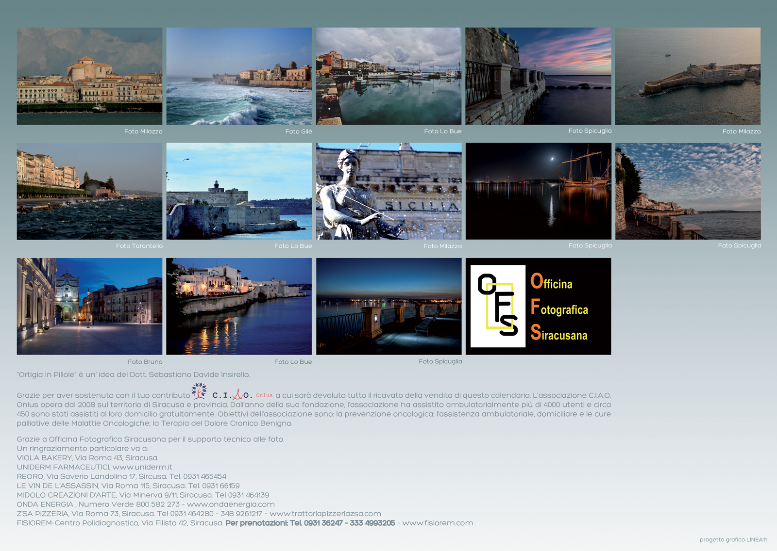 La Farmacia Gibiino si è fatta promotrice dell’ iniziativa Ortigia in Pillole, un concorso fotografico aperto a fotografi dilettanti e non, che premia i 13 migliori scatti con la partecipazione alla realizzazione di un calendario la cui vendita verrà totalmente devoluta alla onlus C.I.A.O.